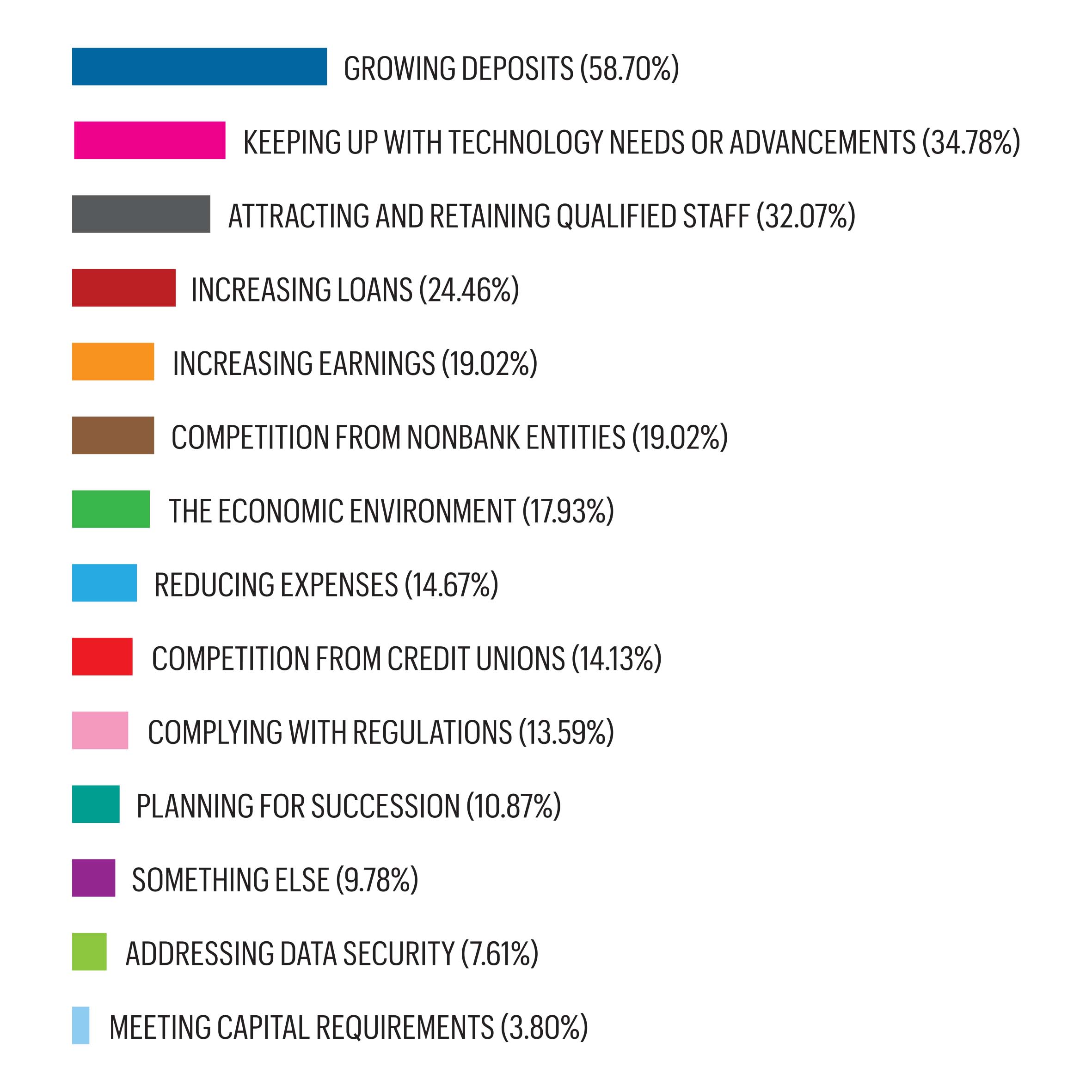 Growing deposits continues to be the greatest business challenge for 2026—cited by almost 60% of respondents, followed by keeping up with technology needs or advancements, attracting and retaining qualified staff, and increasing loans. Increasing earnings, regulatory compliance, competition from nonbank entities and the economic environment were also noted as challenges.